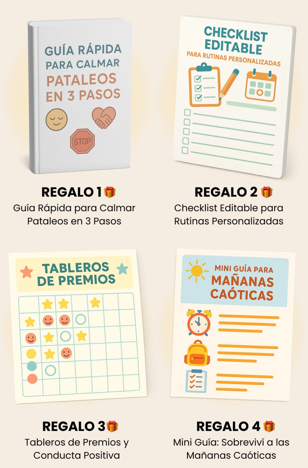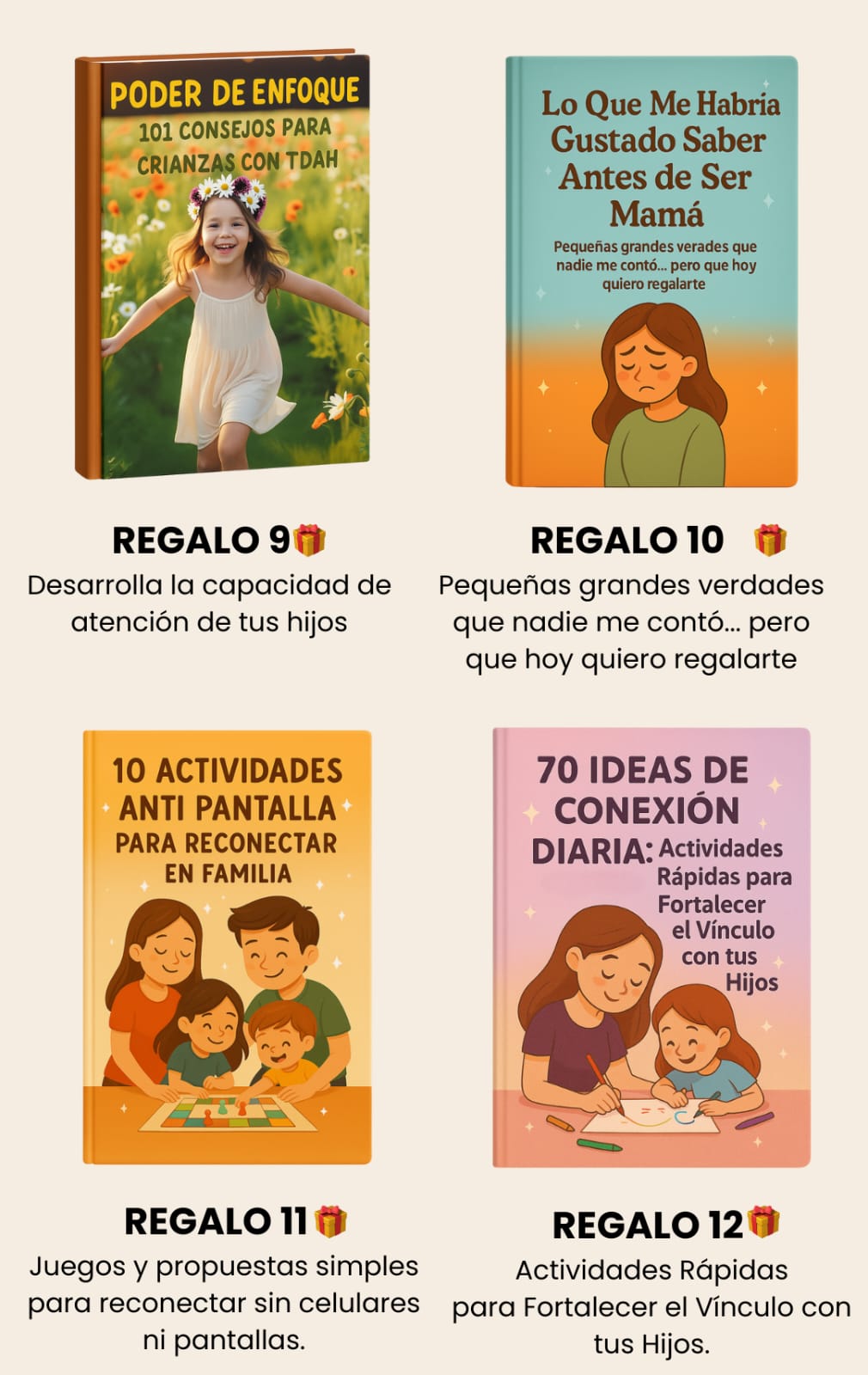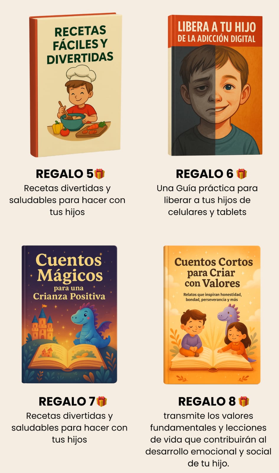 Con el Mega Kit de Crianza Positiva, no solo obtienes herramientas prácticas para transformar tu hogar, sino que te regalamos estos bonos premium para potenciar tus resultados. Imagina una familia más unida, feliz y organizada – ¡todo incluido gratis!